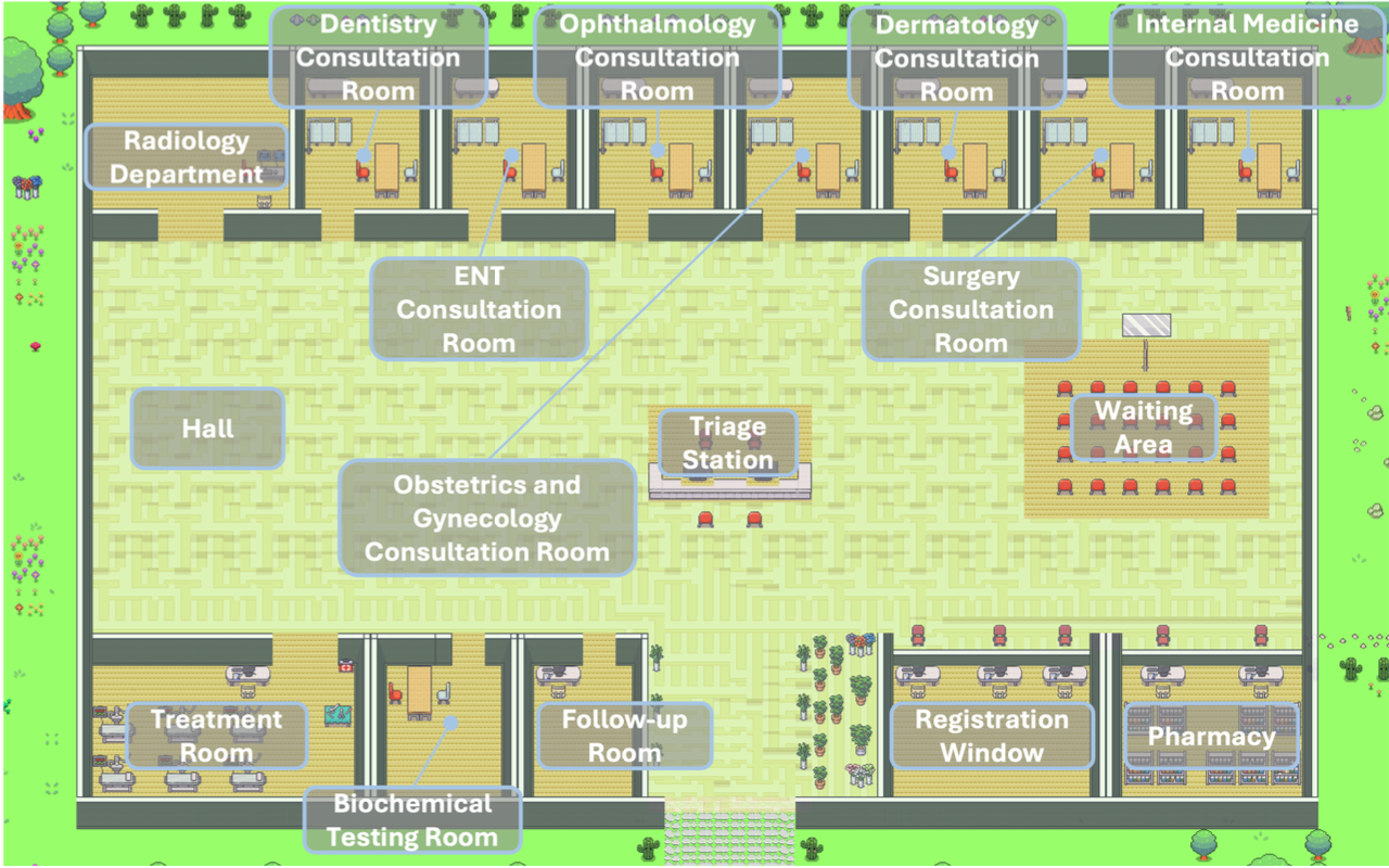 Agent Hospital은 대형 언어 모델(LLM)을 기반으로 한 자율 에이전트들이 진짜 병원처럼 상호작용하는 시뮬레이션 환경입니다. 여기서는 환자의 질병 발생부터 분류, 접수, 진료, 검사, 진단, 약 처방, 회복, 그리고 퇴원 후 추적 관찰까지 의료 서비스의 전체 과정이 시뮬레이션됩니다.